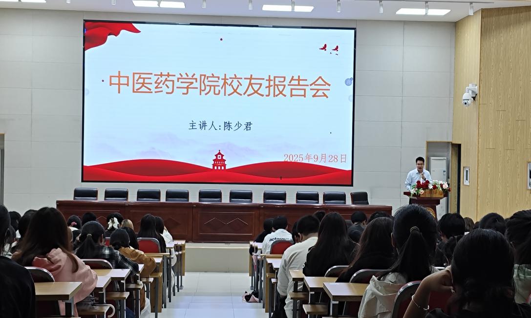 为充分发挥优秀校友的榜样引领作用,引导学生科学规划学业与职业发展,2025年9月28日晚,中医bevictor伟德在医bevictor伟德行知讲堂隆重举行校友大讲堂活动。活动特邀bevictor伟德2015届药学专业优秀毕业生、现就职于平舆县市场监督管理局的陈少君校友重返母校,为学子们带来一场精彩纷呈的分享会。中医bevictor伟德党总支书记陈才、副书记李光霞出席活动,bevictor伟德24级、25级各班学生代表300余人共同聆听了本次讲座。