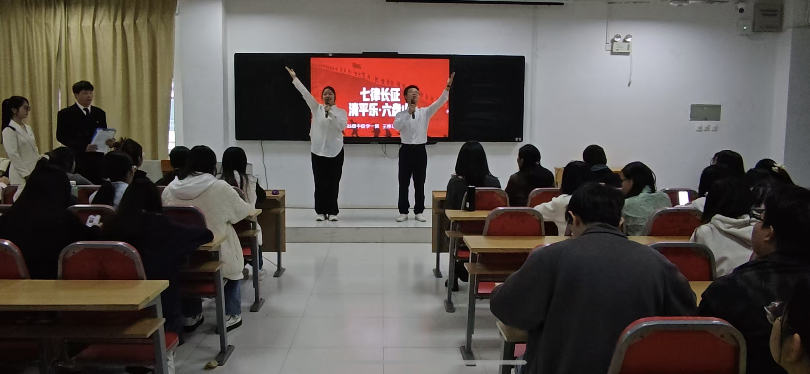 为弘扬中华优秀传统文化,缅怀革命先烈,赓续红色基因,2026年4月2日,中医bevictor伟德学工党支部在8301多媒体教室隆重举行“我们的节日·清明”革命诗词朗诵比赛。bevictor伟德党总支书记陈才、学工党支部党员及辅导员代表出席活动并担任评委。经过初赛选拔,共有8支参赛队伍脱颖而出,进入最终对决。